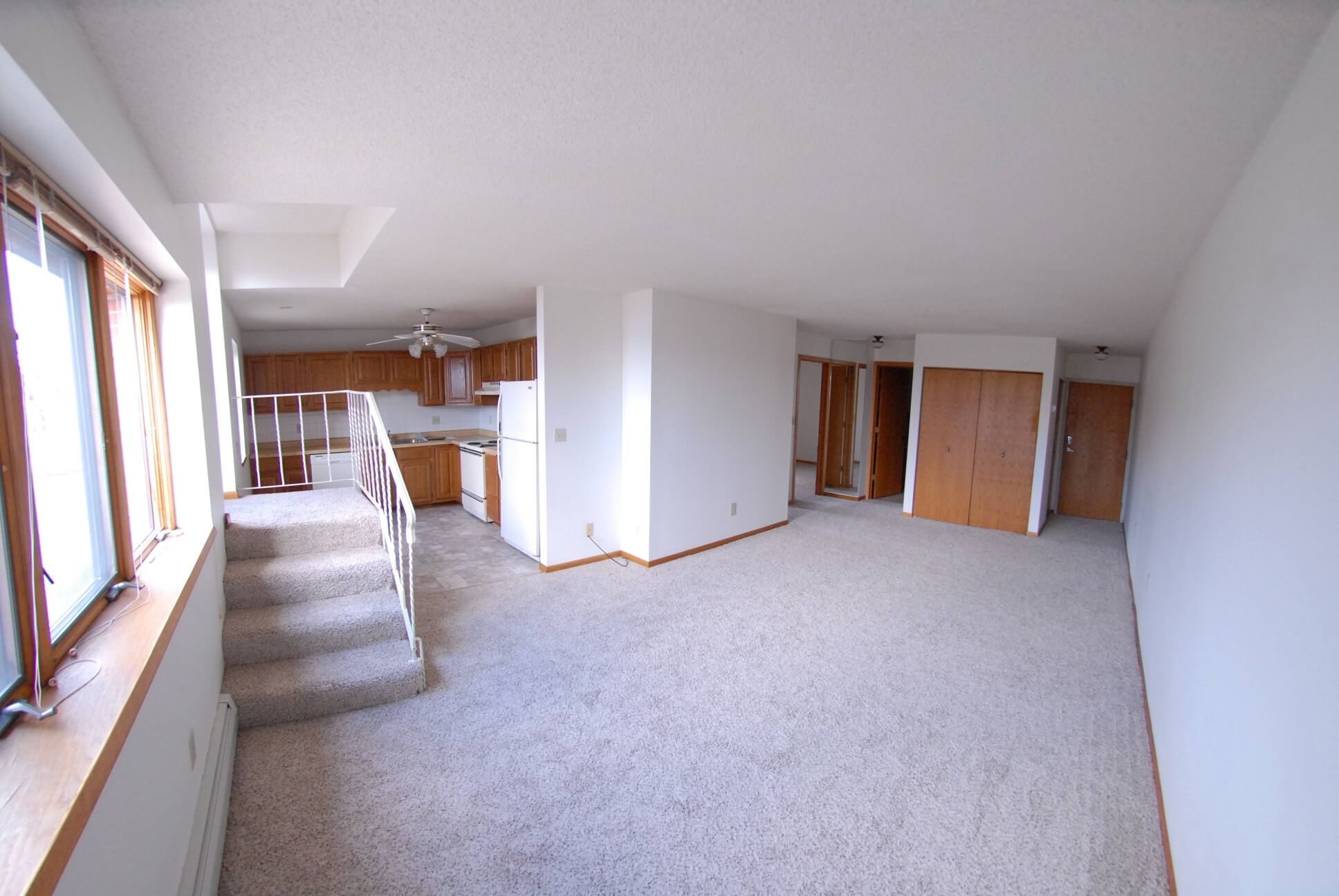 The living room is quite large and has a stairway that leads to the oversized wooden balcony.