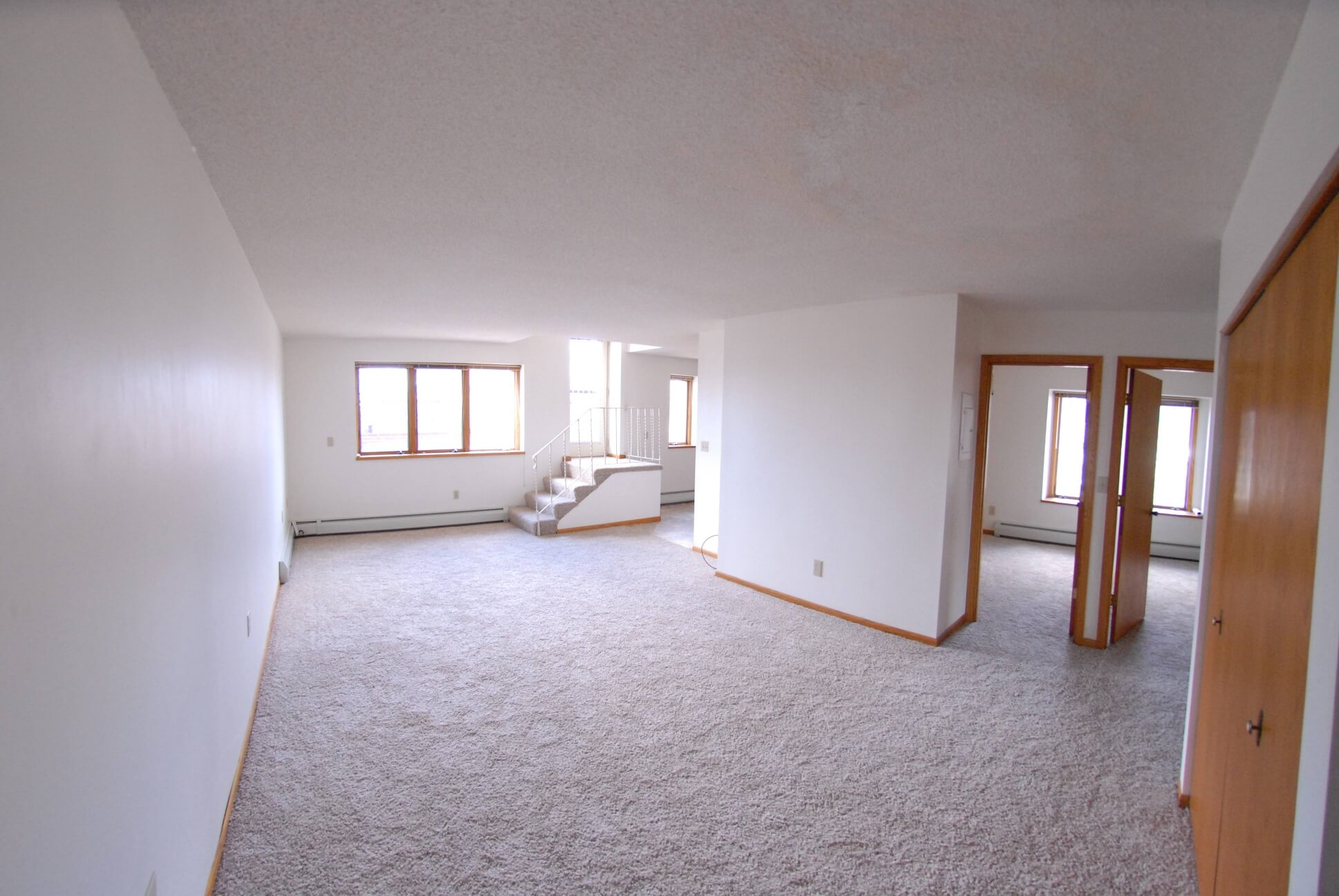 The living room is quite large and has a stairway that leads to the oversized wooden balcony.